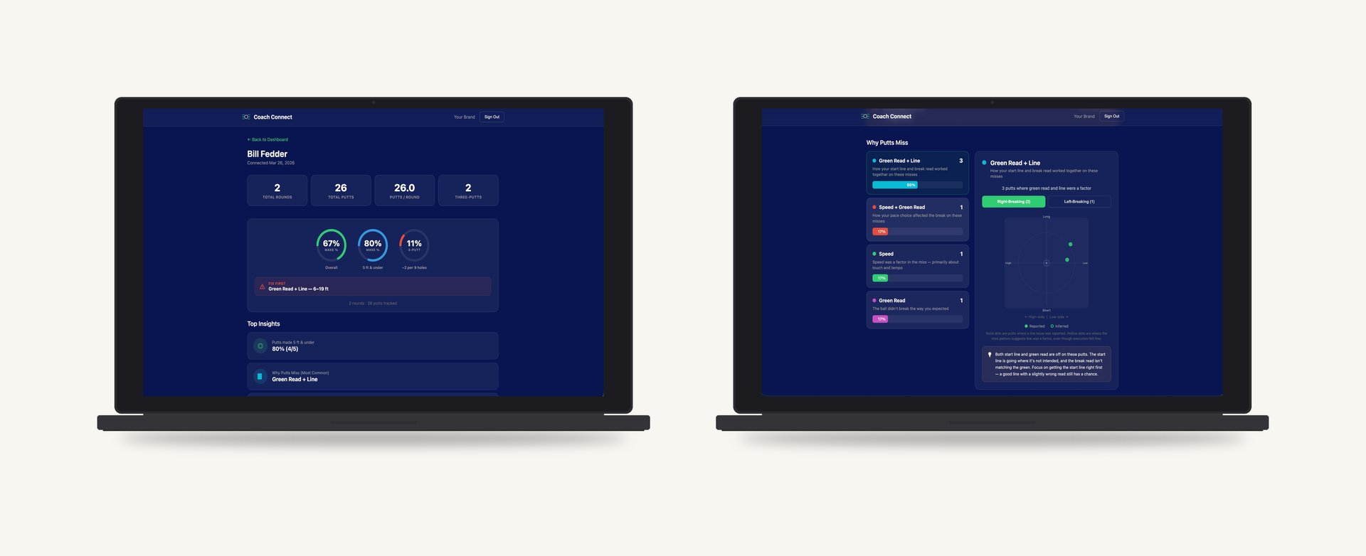 Your Students' Data. Your Coaching. One Platform.Coach Connect gives you a free portal to see how your students are putting between lessons. When your students use 3 Pillars Putting, their round data — miss patterns, pillar breakdown, speed and line tendencies — is available to you in real time. No more guessing what they've been working on. No more relying on memory