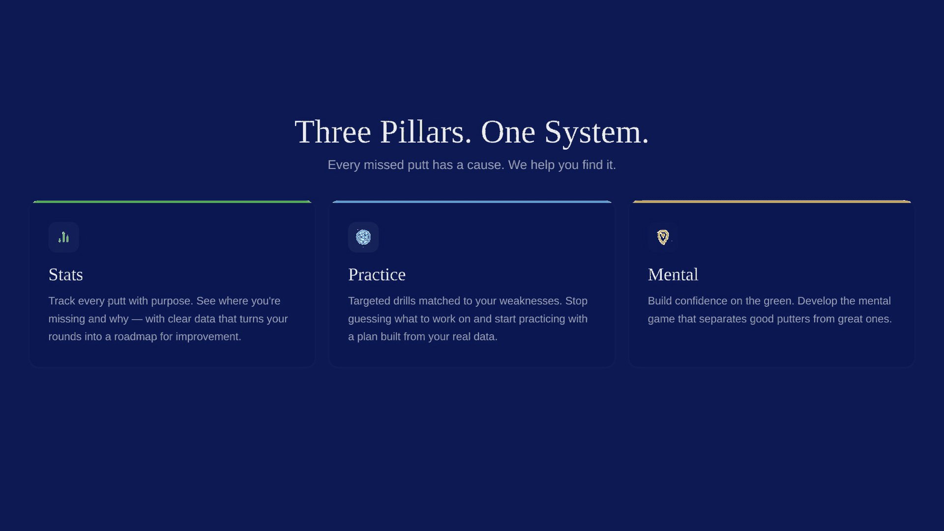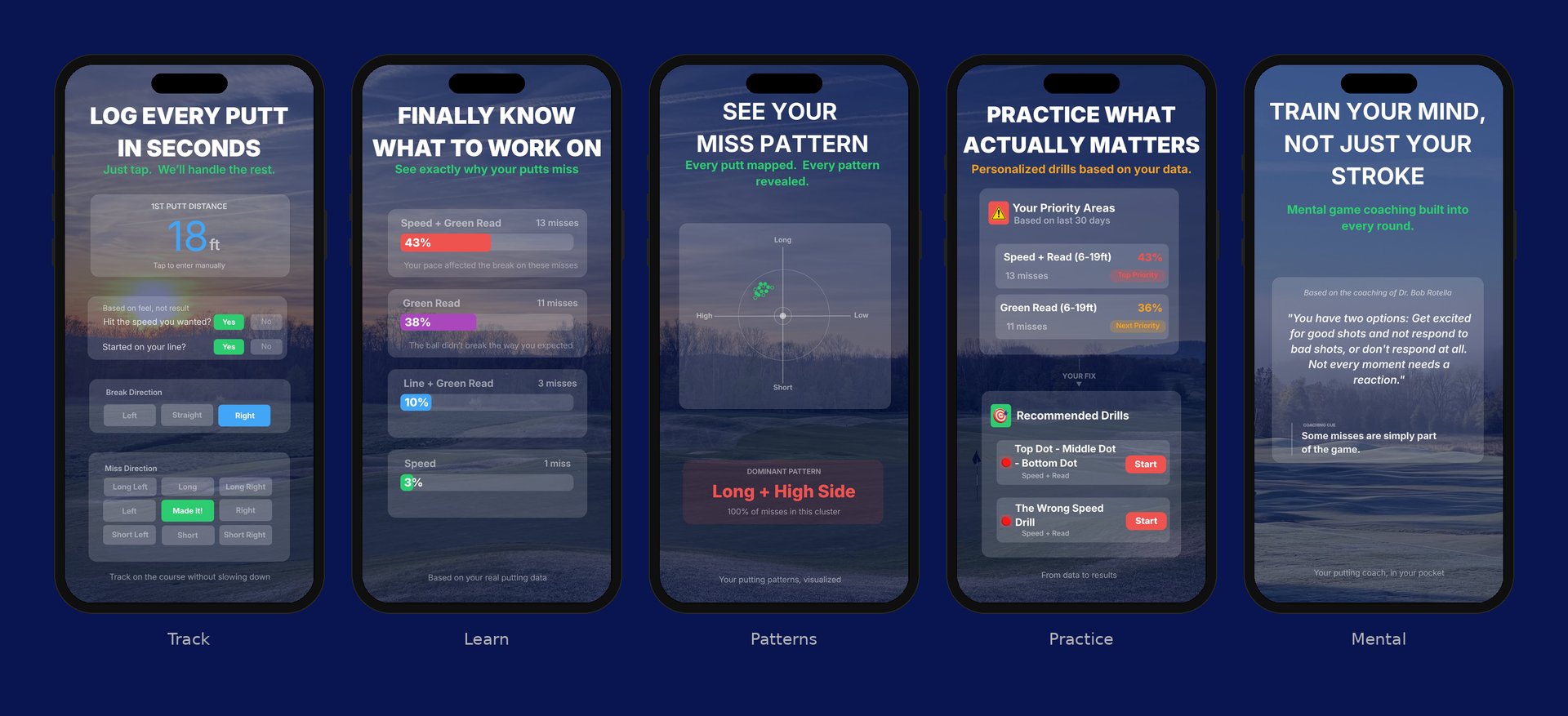 Step 2: Learn The app breaks down your misses into their root causes — speed, line, or green read — and shows your patterns through clear charts and stats.